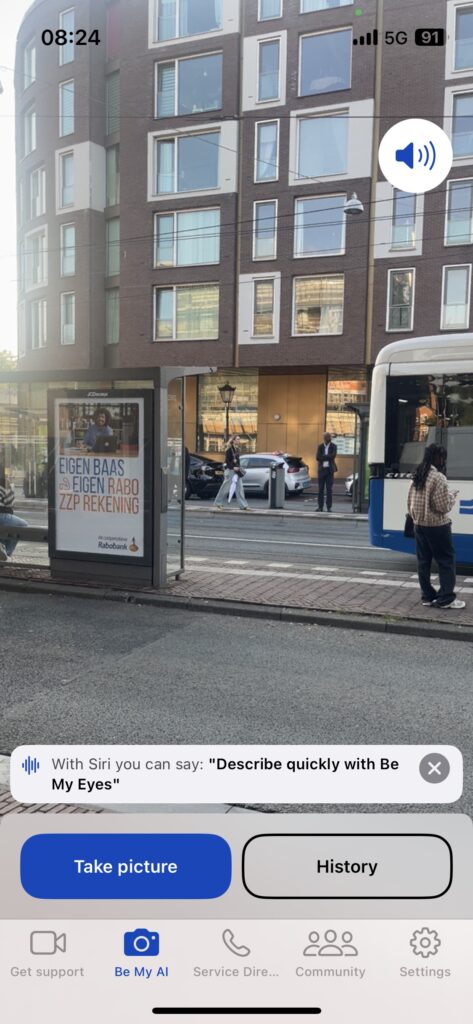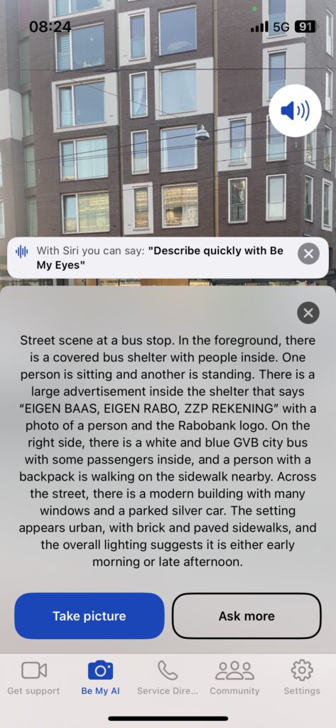 I also tried the app Be My Eyes AI mode, to take a picture in public transport and describe what I see, so that I could decide on my next step. The description of the photo was very detailed, and with the information I know that I am near the bus stop. I don’t know if this description provides enough information to take action, but that might not be the goal of Be My Eyes. If it’s really just to describe a scene of what’s in front of you, it does a good job. In this way, I can see how advanced technology like AI is empowering when it meets the goal you’re trying to achieve (simply describing what’s near).