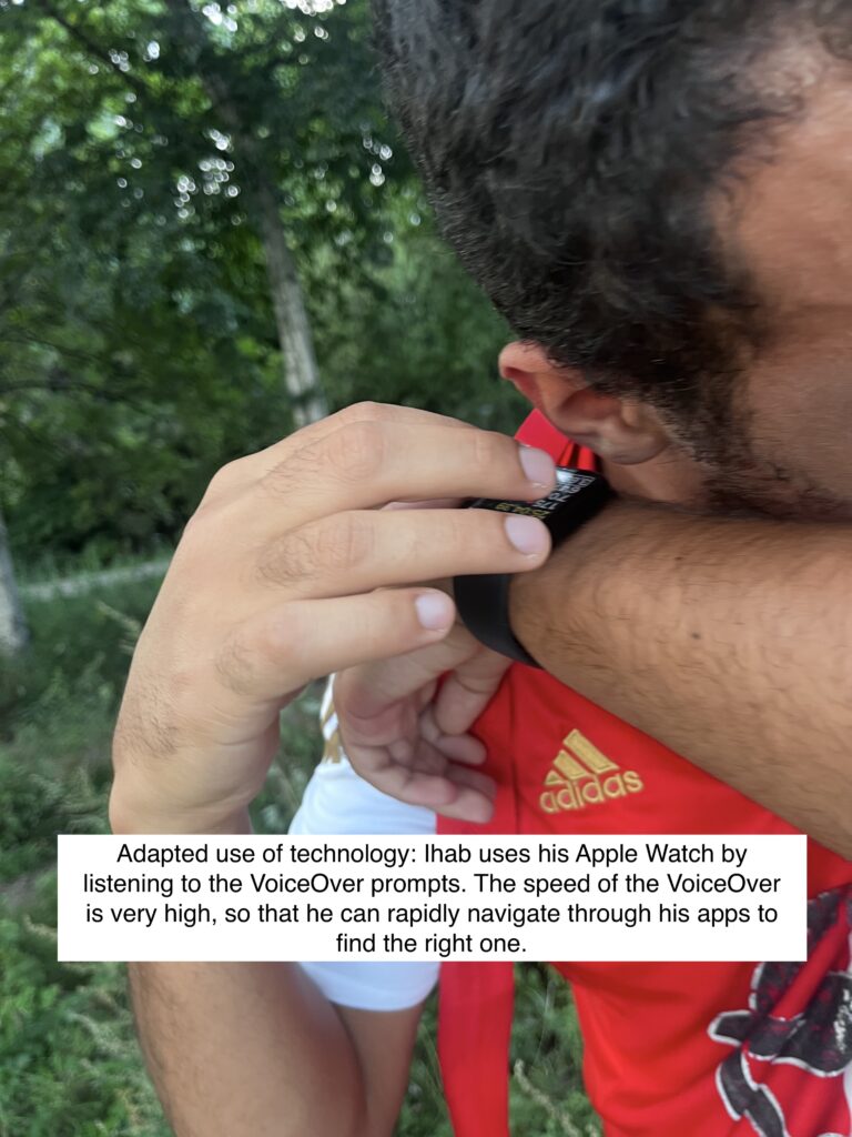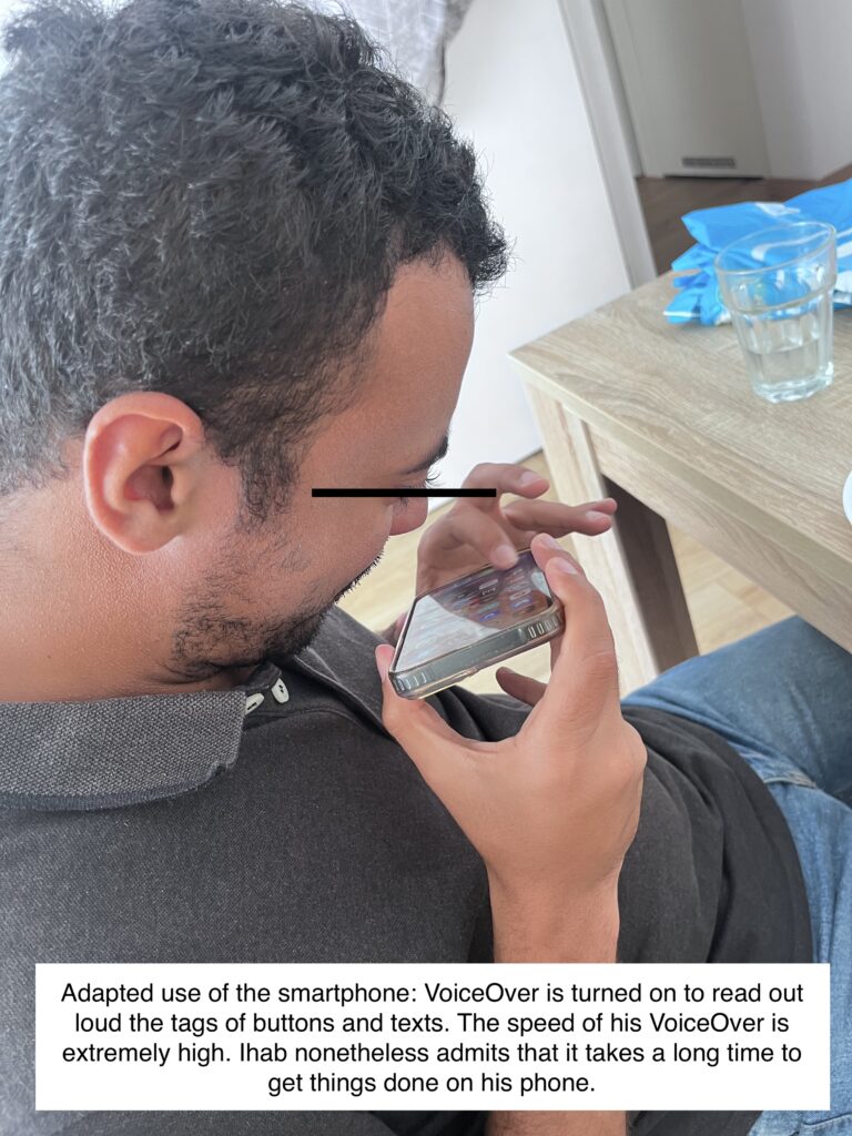 - When I watch Ihab use his smartphone, he talks to his phone rather than viewing the screen. He has iPhone’s VoiceOver mode turned on. He holds his smartphone close to his face and rapidly taps the screen to navigate to the correct app or button. The phone’s voice dictates the buttons he is touching when he is on a website. When on Whatsapp, he holds the voice recorder to dictate what he wants to type. Going online watching BlindTok I see how AI helps the legally blind using a smartphone to explain what is shown in a video on a smartphone screen, or what is in the person’s near vicinity when pointing the smartphone in a certain direction. Furthermore, I see that Ihab wears an Apple Watch. I don’t see him use the watch.