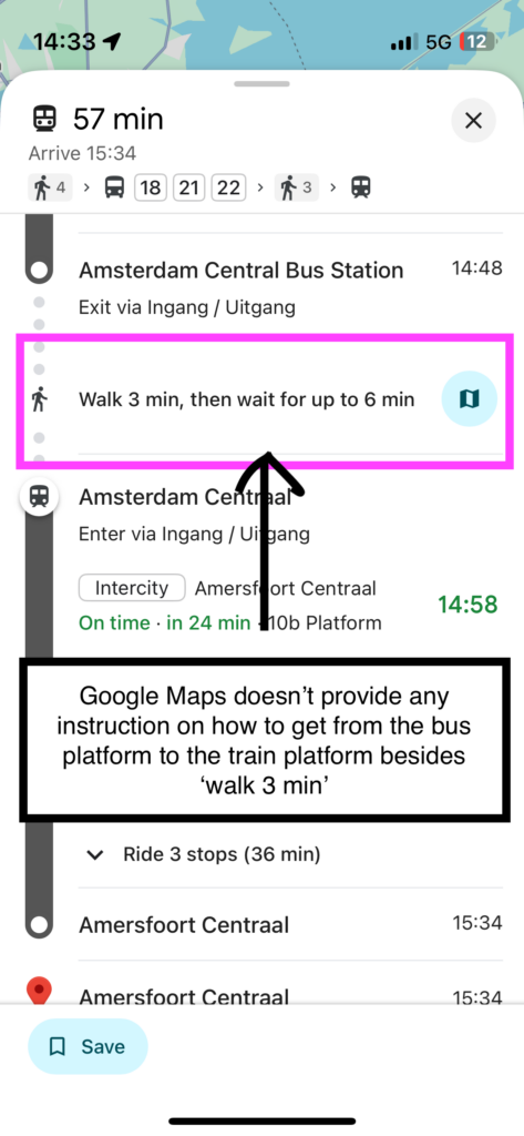 Ihab corroborated this by mentioning that if he switches travel medium (from bus to tram or to train), he always needs to ask for help as Google Maps (his preferred app), doesn’t navigate within stations.