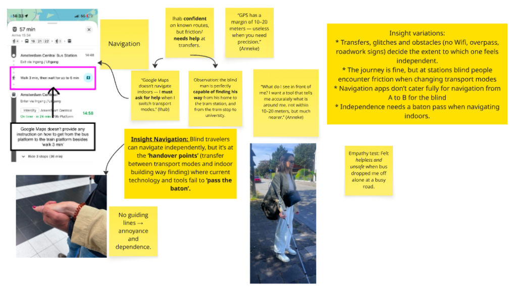 - Observation: the blind man is perfectly capable of finding his way from his home to the tram station, and from the tram stop to university. Yet, the interview revealed: “Google Maps… doesn’t navigate within stations; I always need to ask for help when I switch transport modes.”