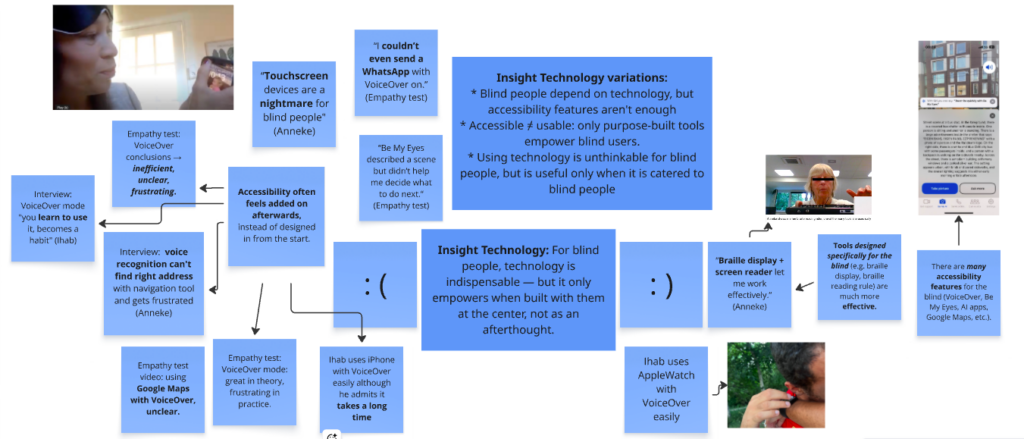 Thanks to the interview, I have gained more insight into the lives of blind people. Specifically, I hadn’t realised how dependent blind people are on technology to simply live their lives. Navigation is a highly interesting domain to explore further, as both Anneke and Ihab mentioned this as the domain in which they experience most frustration. This made me realise how much untapped potential there might be in using AI/tech to help the blind. Besides, I hadn’t thought of the social aspect of the challenges the blind face. Walking around with a guiding stick or dog draws attention, and whatever solution we might at some point think of, shouldn’t add to the awkwardness blind people face daily.