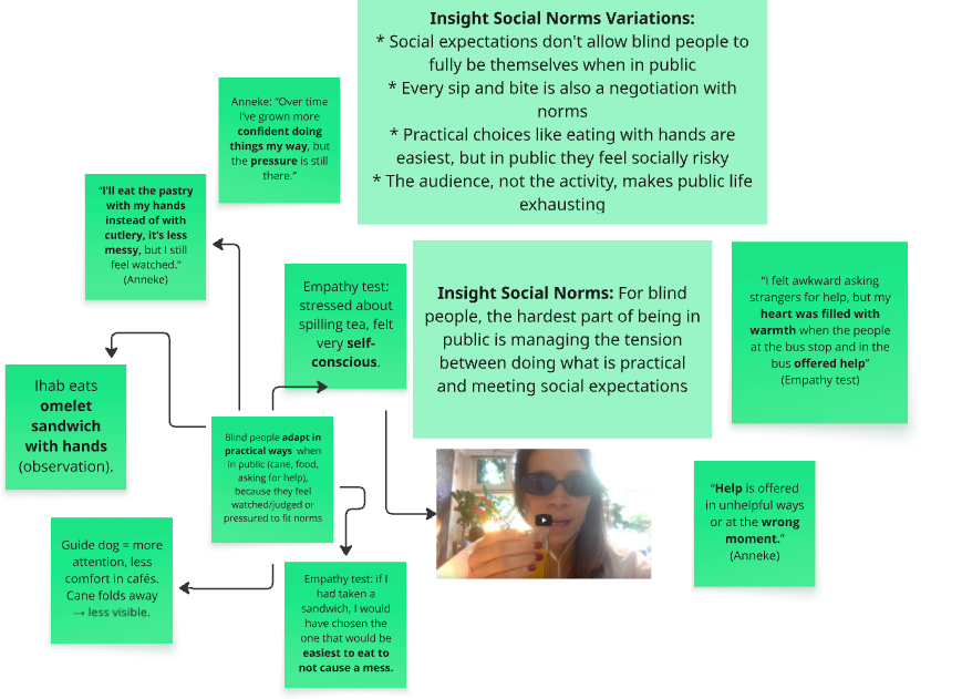 - Why this stood out: It highlights that the challenge is not just physical or technological, but also social. Blind people need environments and interactions that allow them to use practical adaptations without stigma or unnecessary pressure. This is a latent need.