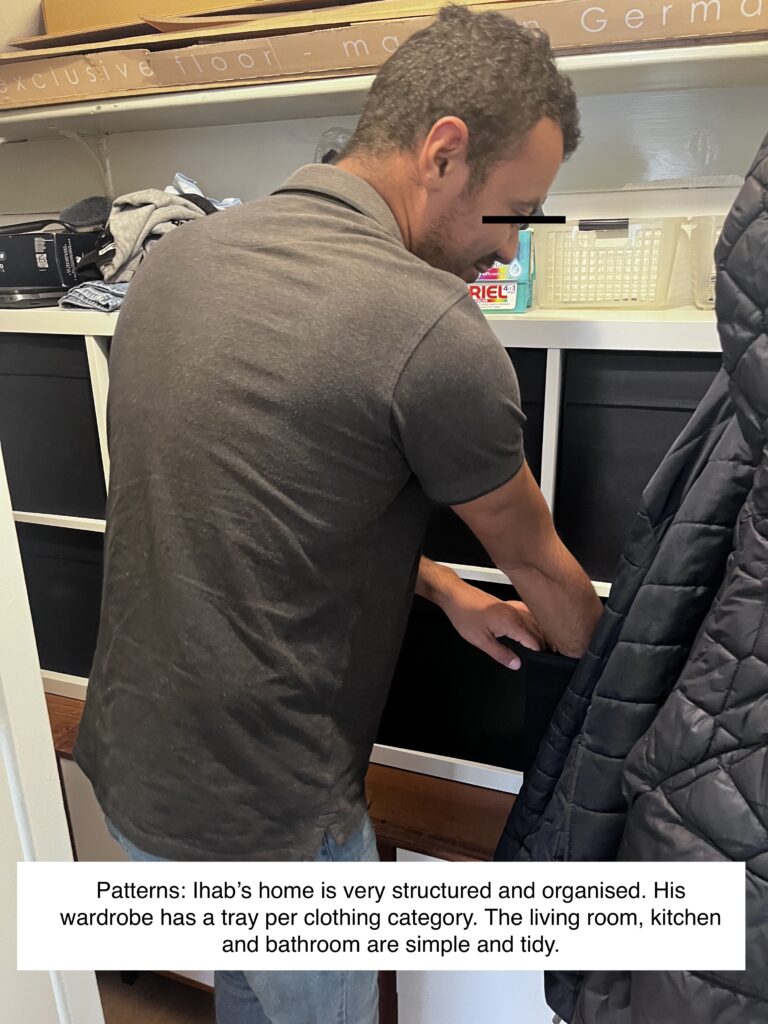 - The pattern I see is structure and organisation: his home is very neat and organised. For example, all his clothing is organised per tray, and he knows exactly which tray is used for which clothing category. In the kitchen, the cabinets all have a specific purpose, as well as the drawers for cutlery. His bathroom and bedroom are decorated simply.